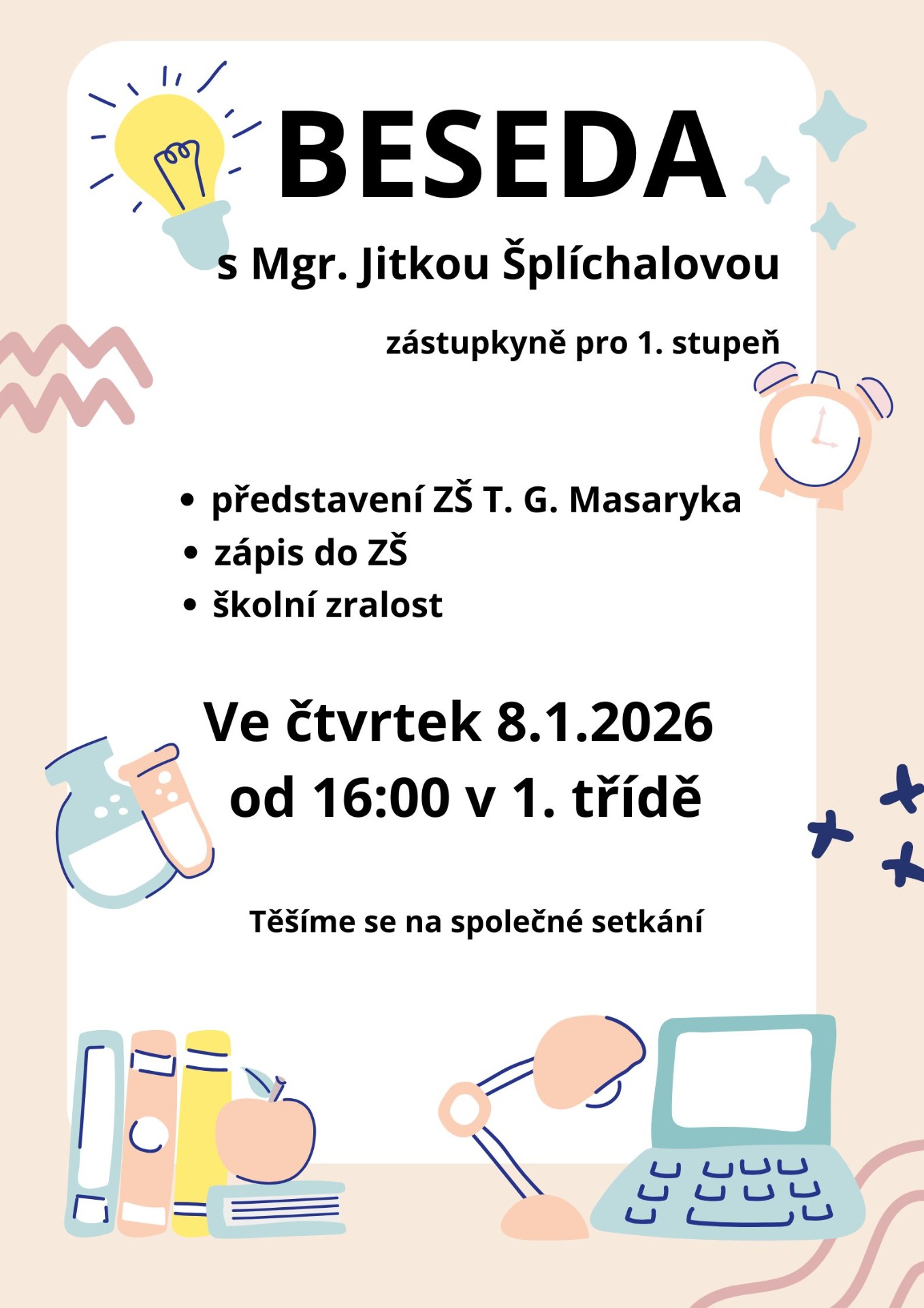 srdečně Vás zveme na BESEDU s Mgr. Jitkou Šplíchalovou- zástupkyní pro 1. stupeň ZŠ T. G. Masaryka.