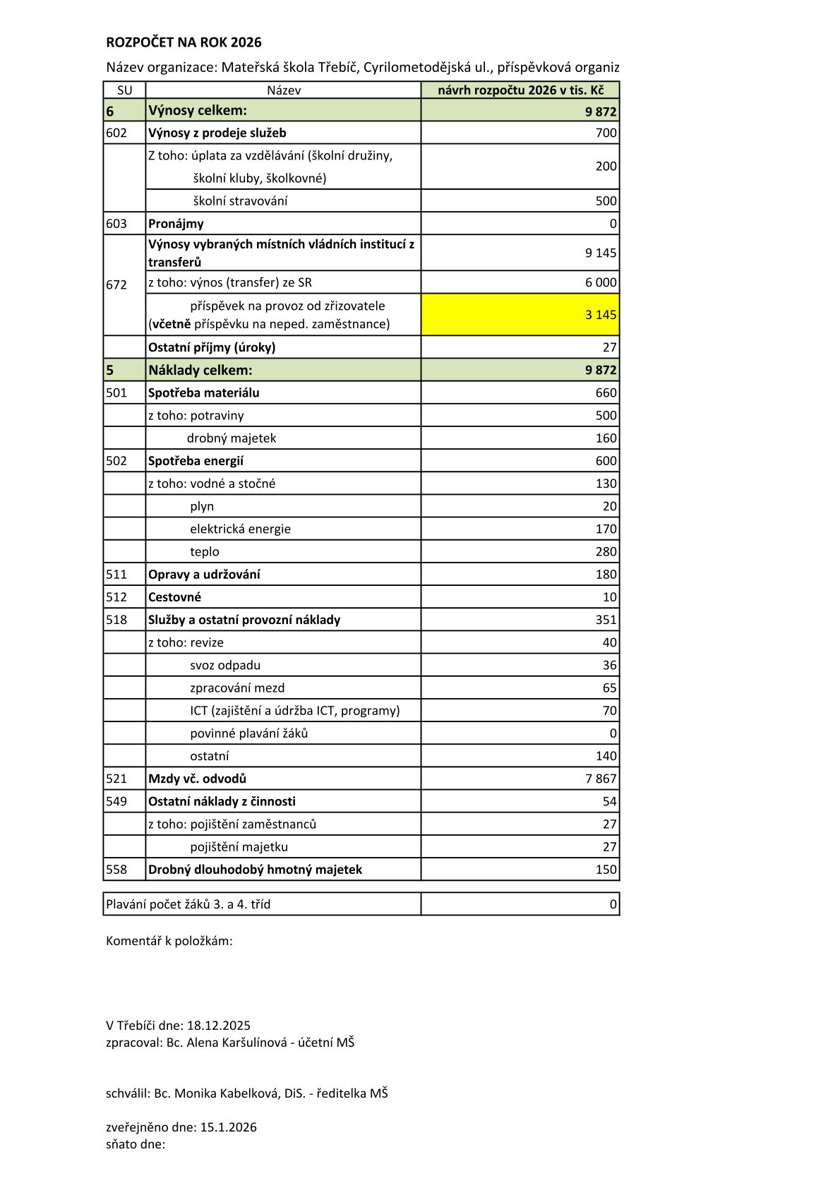 Rozpočet na rok 2026